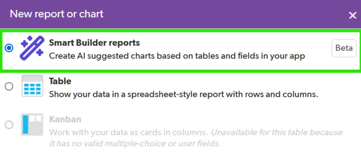 To get started, just select the SmartBuilder Beta option when creating a report.